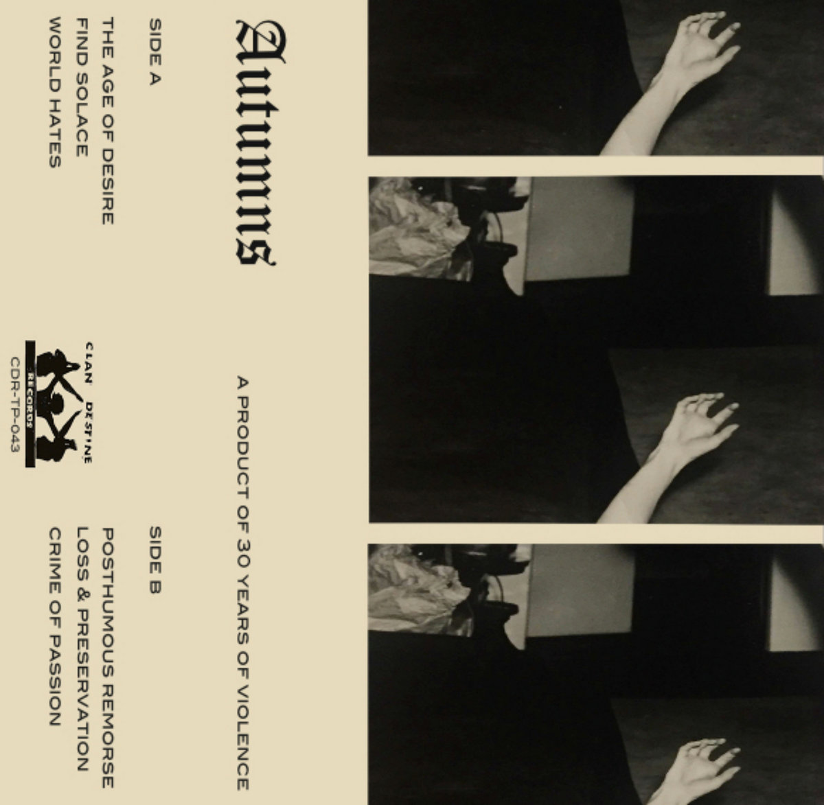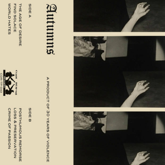 “A Product of 30 Years of Violence” is the new release by Christian Donaghey, AKA Autumns. In the build-up to Autumns debut album, an EP of six songs delivering a diverse range of sonic explorations, concepts and limitations is to be released on Clan Destine Records to document the music made during the months of Summer and Autumn of 2016. The EP will suitably come out digitally and on a limited run of cassettes, due out in November 2016.